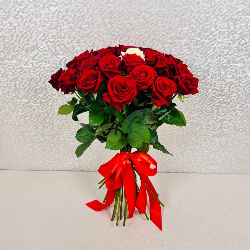 Не знаете какие розы подарить: красные или белые? Выбирайте контрастное сочетание двух цветов в букете из 25 штук. Идеально ровные стебли шикарных роз перетянуты лентой, чтобы букет держал форму и не распадался в вазе.